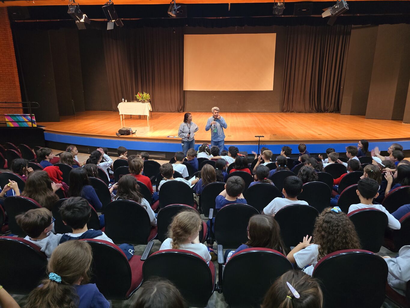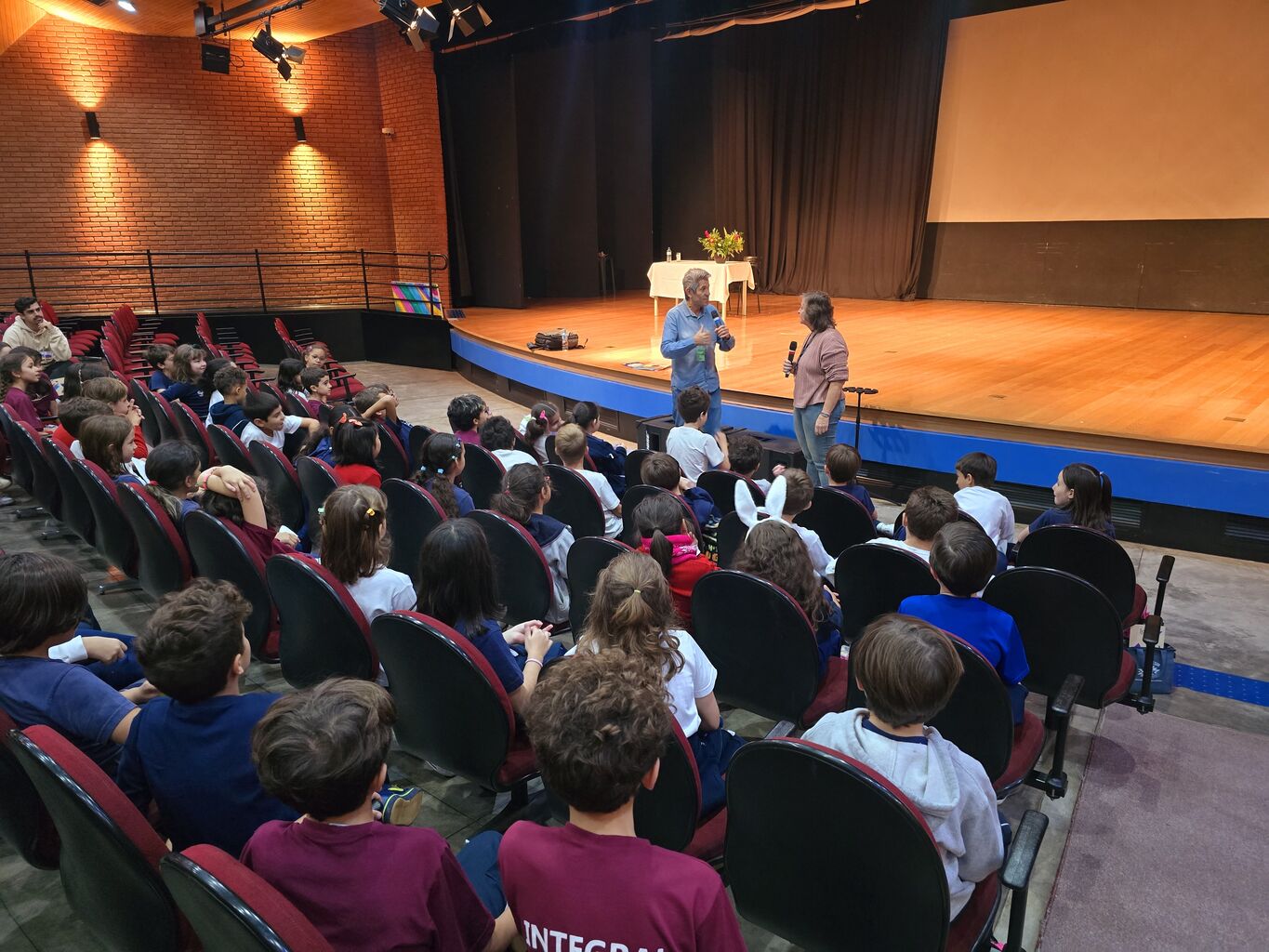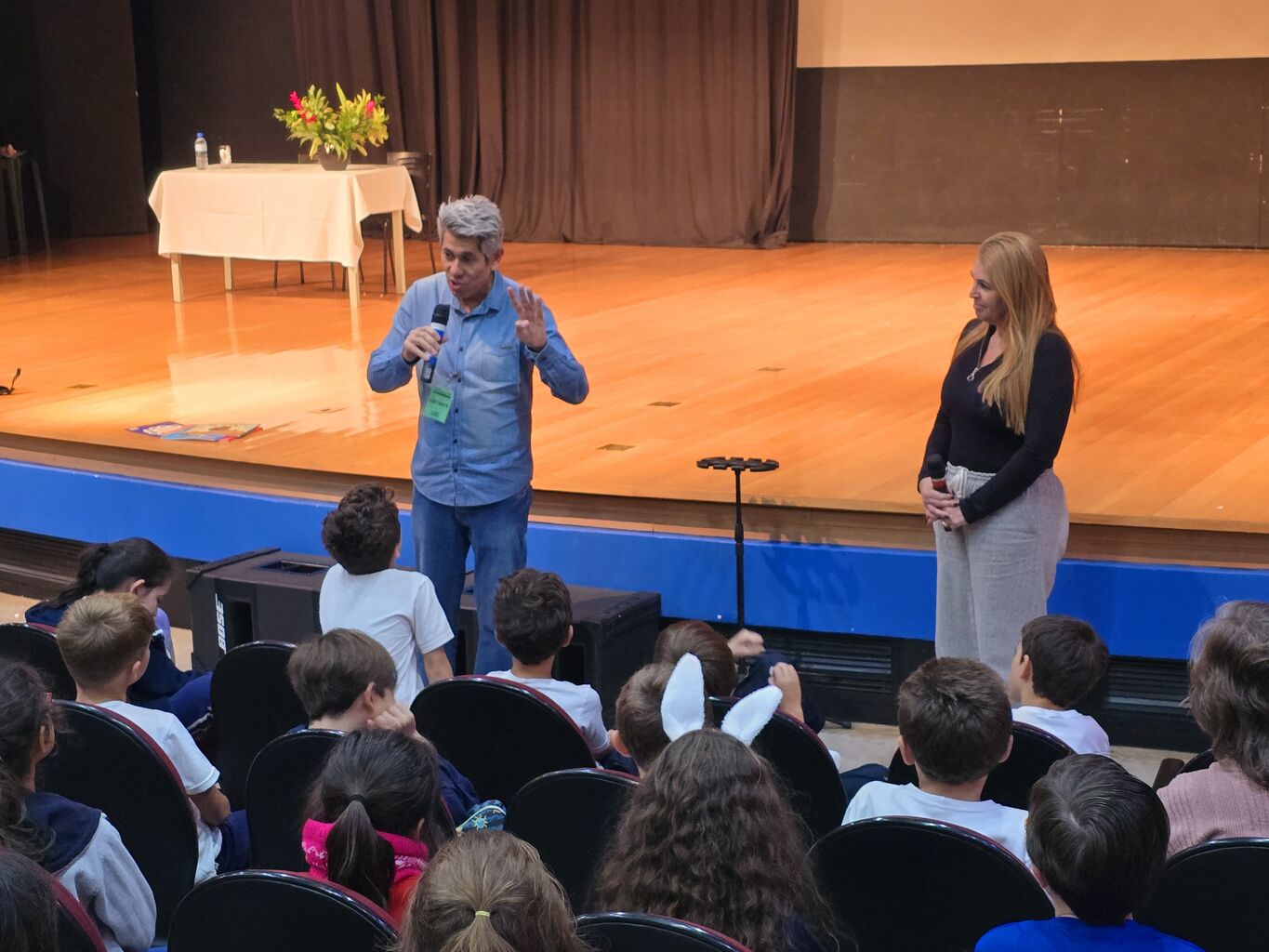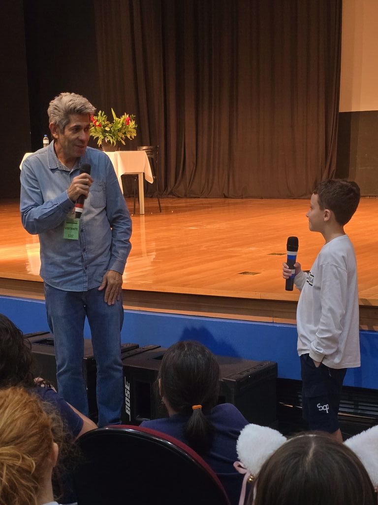 Após a leitura do livro, como complemento ao trabalho proposto, convidamos o autor Jonas Ribeiro para vir ao colégio conversar com os alunos. Durante o encontro, Jonas se conectou com seus leitores mirins por meio de brincadeiras, rimas e poesias, e respondeu às perguntas sobre sua vida, obra e carreira como escritor. Autor de mais de 150 livros infantojuvenis, Jonas tem o dom de cativar crianças e adultos com suas belas histórias!