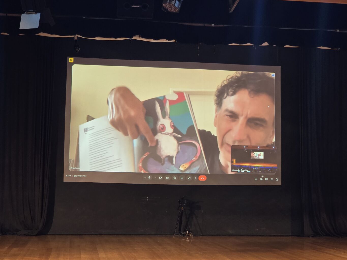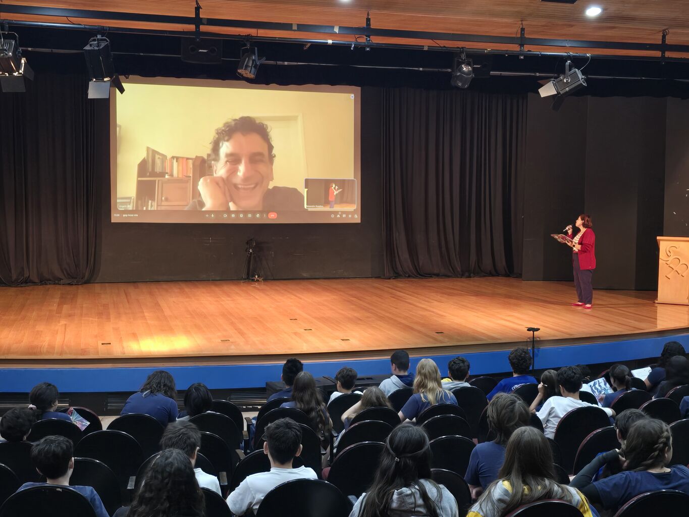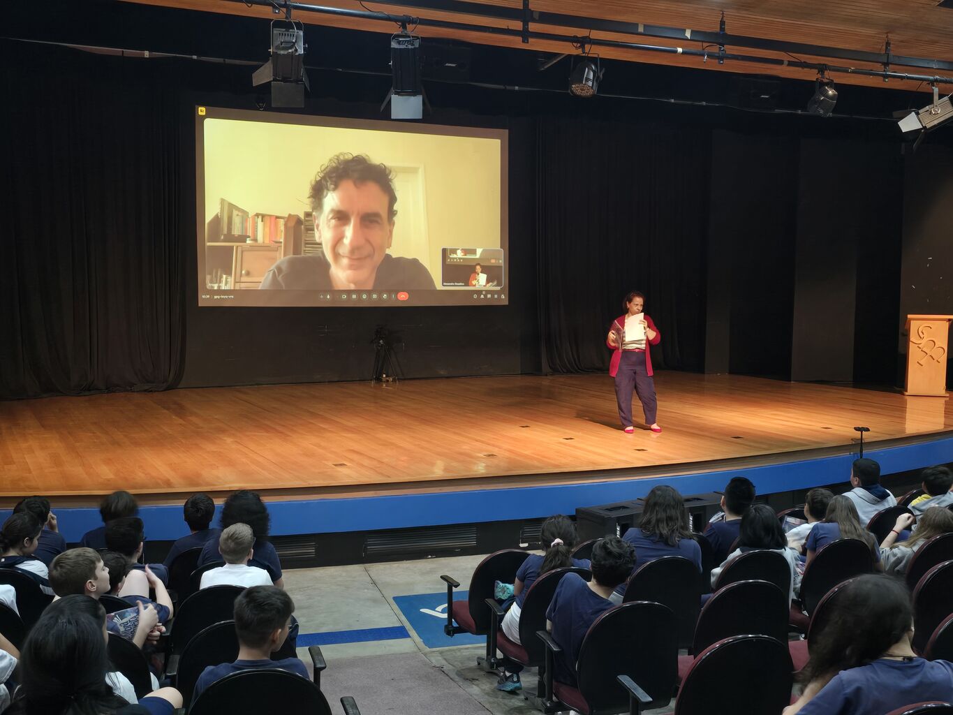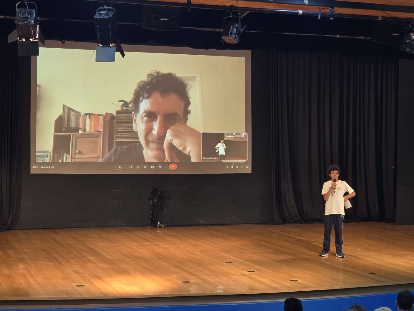 No 7º ano, os estudantes dialogaram com o ilustrador Angelo Abu sobre o livro À Sombra da Mangueira. A obra nasceu de um projeto colaborativo em Maputo, Moçambique, onde jovens da ONG Hakumana compartilharam histórias tradicionais africanas. Abu ilustrou essas narrativas, que foram registradas e estão disponíveis por meio de QR Codes no livro, permitindo que os leitores ouçam as histórias no sotaque local e nas línguas nativas Changana e Ronga. O encontro foi uma imersão na rica cultura moçambicana e na importância da oralidade na preservação de tradições.
